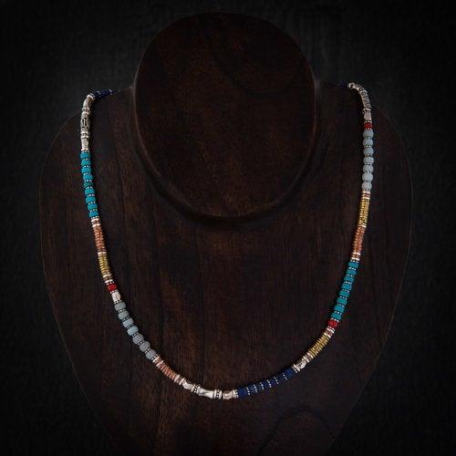 An explosion of gemstones: Turquoise, Lapis Lazuli, Amazonite and Coral are used in this delightful necklace. Handmade in Bali. Boasting stunning colours, this necklace is an eye-catching piece for any special occasion. It is made with superior quality and craftsmanship, making it a timeless accessory.