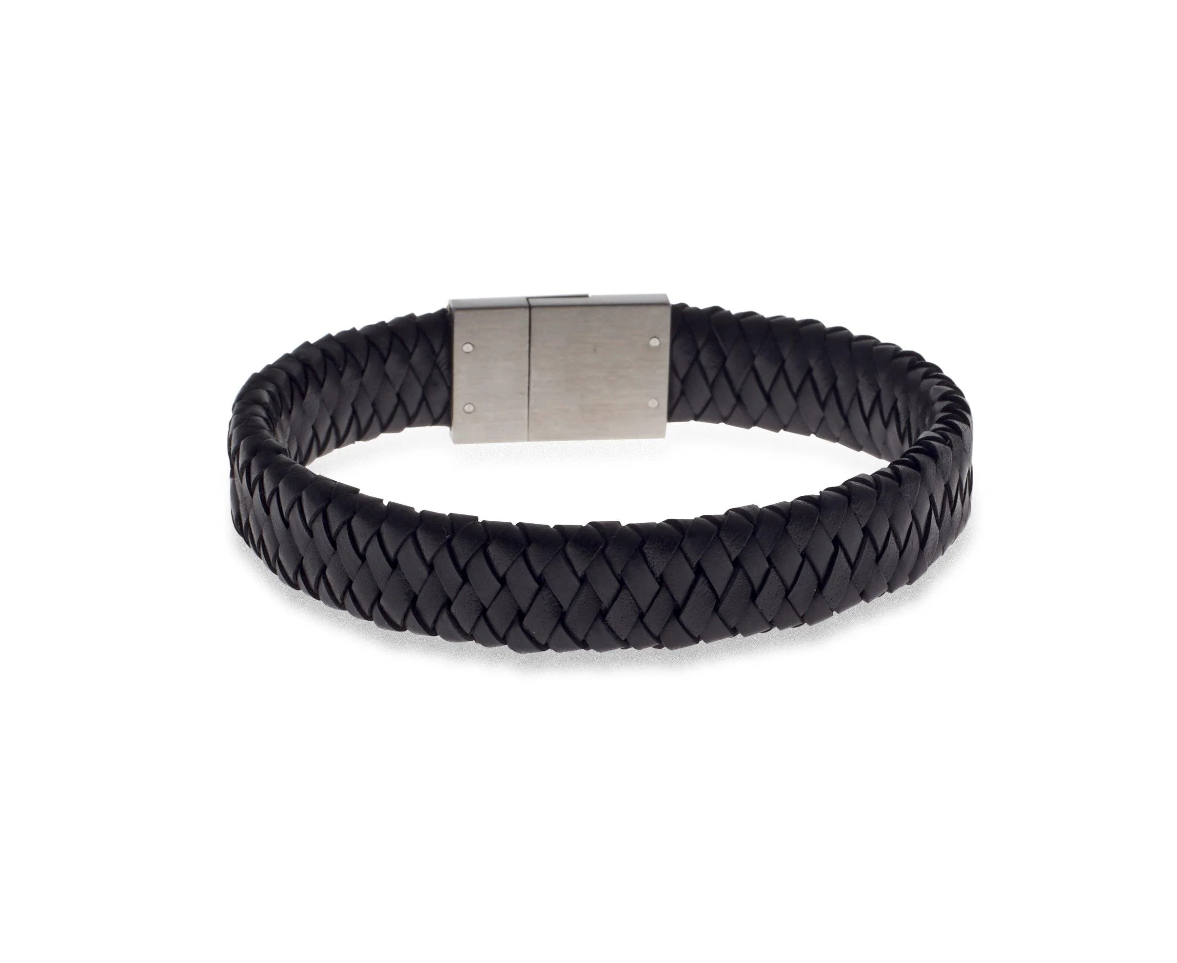 Flat Italian high-quality leather weaved into a men's bracelet with a steel clasp that is secured with a strong magnet.